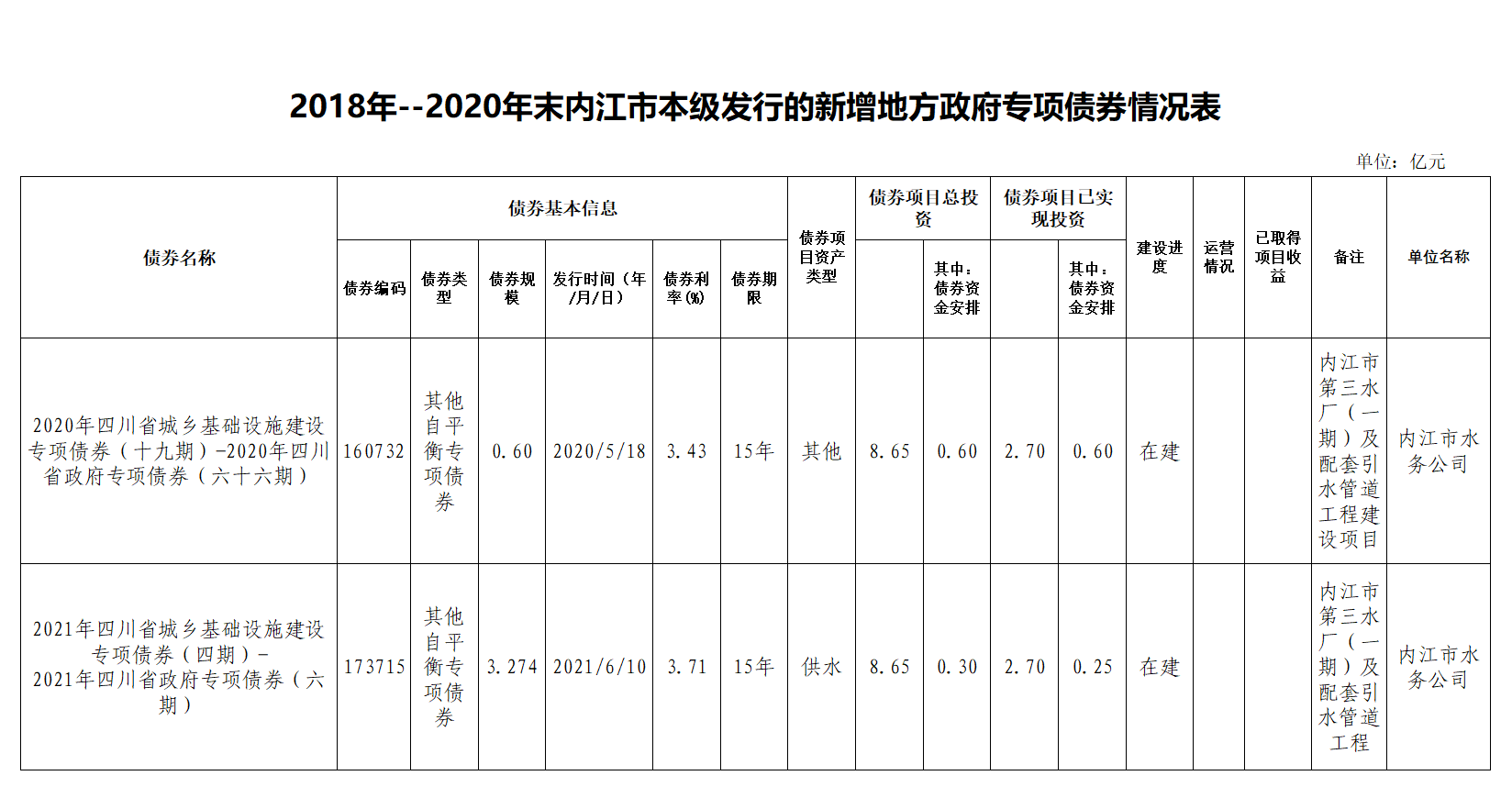 2018年--2020年末內(nèi)江市本級(jí)發(fā)行的新增地方政府專項(xiàng)債券情況表