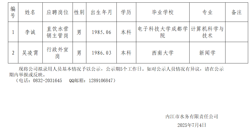 內(nèi)江市水務(wù)有限責(zé)任公司2025年7月擬招聘人員公示情況表