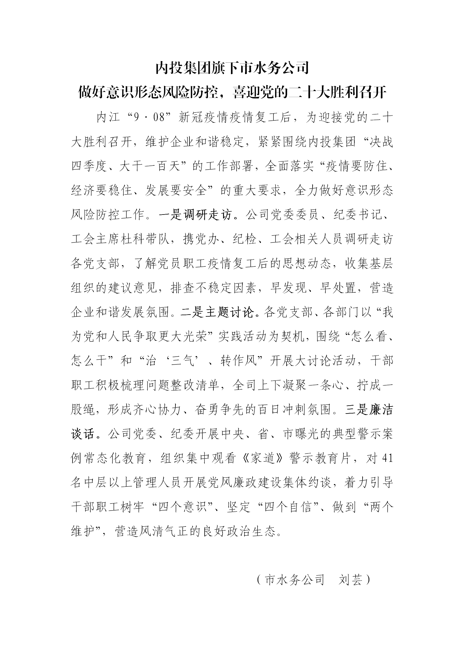 內投集團旗下市水務公司 做好意識形態(tài)風險防控,喜迎黨的二十大勝利召開