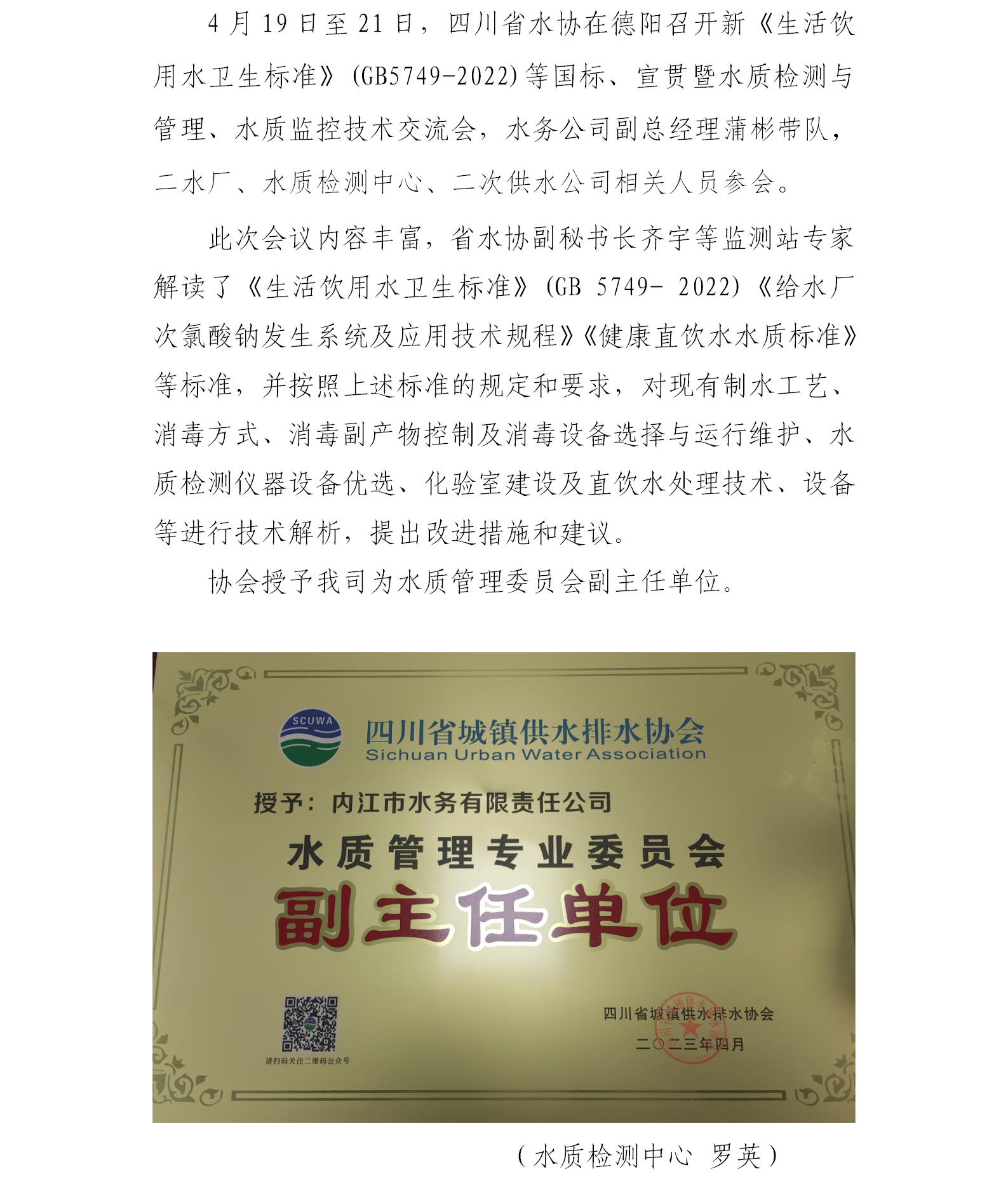 內江市水務公司獲省水協(xié)授予水質管理專業(yè)委員會副主任單位